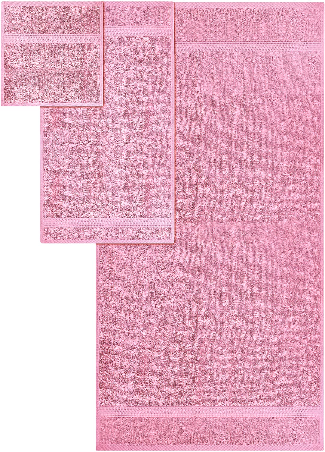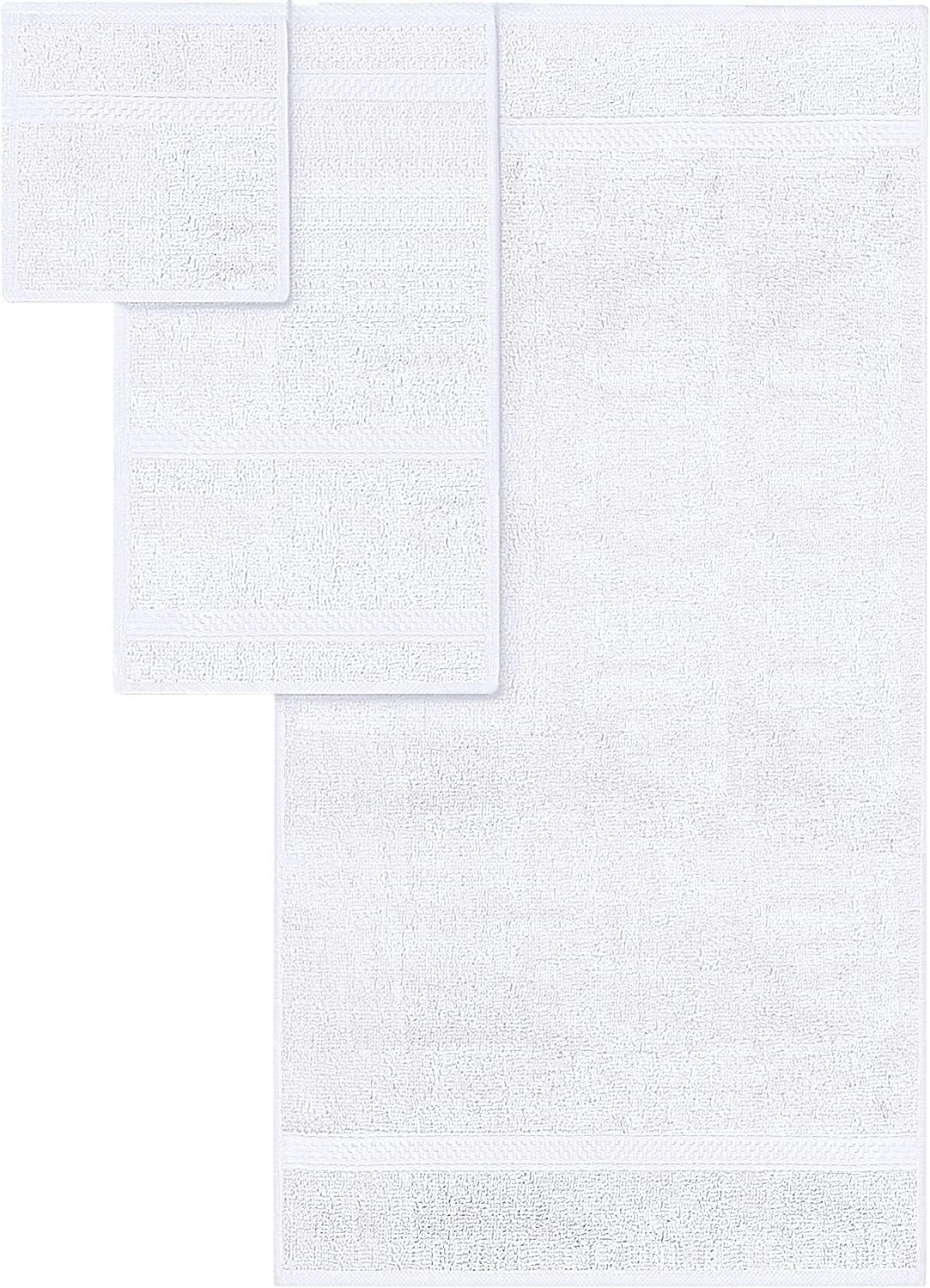 Set includes 2 bath towels of 27 inch by 54 inch; 2 hand towels of 16 inch by 28 inch; 4 washcloths of 12 inch by 12 inch.